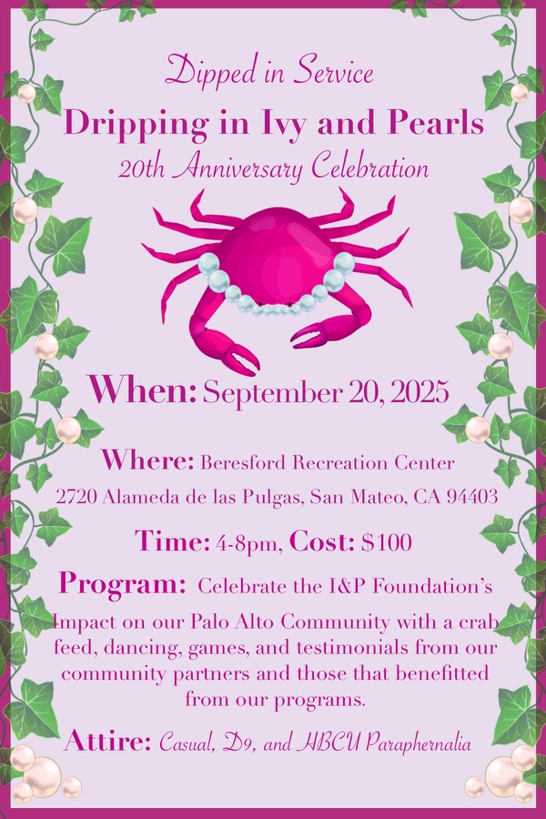 Celebrate 20 Years of Impact! Join the Ivy and Pearls Foundation for our 20th Anniversary Celebration—Dipped in Service, Dripping in Ivy and Pearls. This unforgettable evening will honor our legacy of service in Palo Alto and surrounding communities, recognize our incredible Community Partners, and raise funds to fuel our ongoing charitable mission. Enjoy a lively crab feed, music, dancing, raffles, and the spirit of community connection.